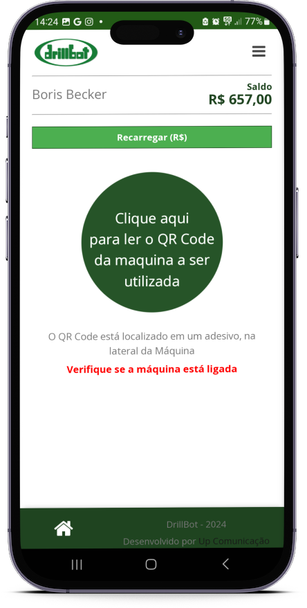 Clique no botão ao lado para abrir a câmera e apontar para o adesivo com o QRCode, localizado na lateral da máquina