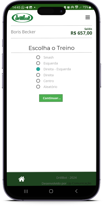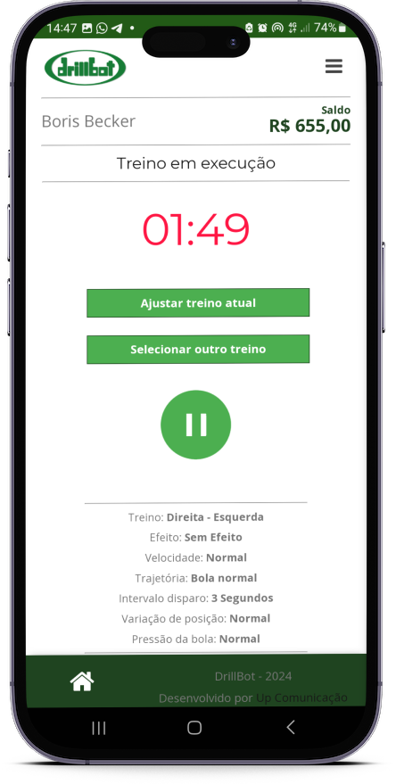 A qualquer momento do treino em andamento, é possível aplicar “pausa” no lançamento das bolas e também é possível fazer ajustes no treino atual ou escolher outro tipo de treino