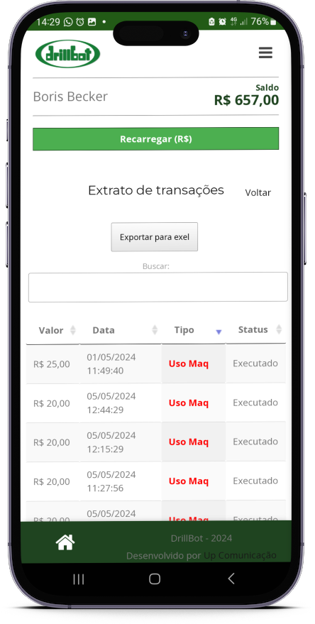 É possível ter acesso ao ‘extrato de transações’ onde o usuário pode ter acesso a todos os seus registros de utilização das máquinas e também aos seus registros de compra de créditos